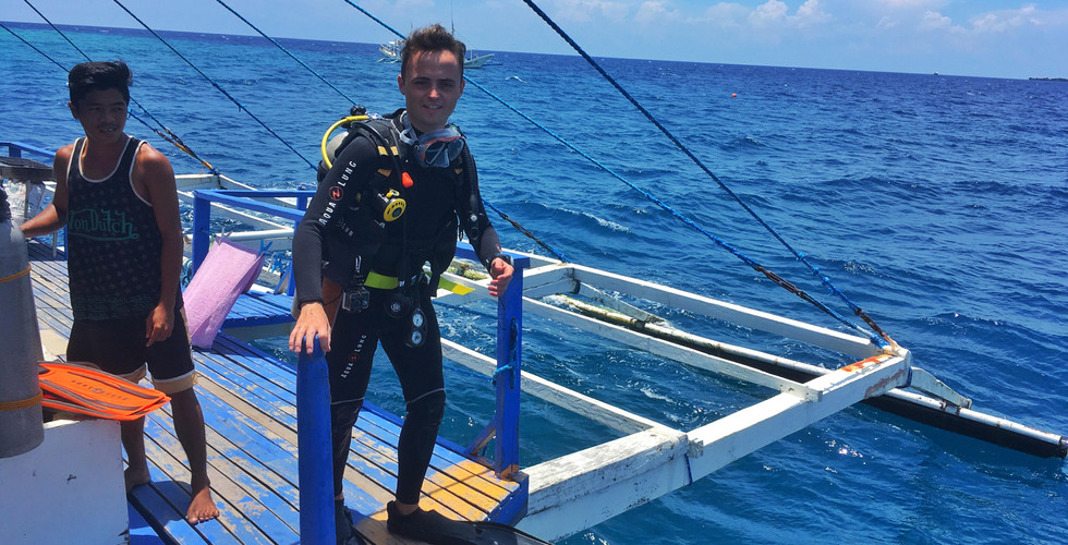The trip was divided into two halves, the first around Apo Reef, which is the second largest contiguous coral reef in the world, exceed only in size by the Great Barrier Reef. Unsurprisingly, it was home to a wealth of incredible marine life which we marvelled at on each dive. We jumped in for our first dive at 7am each morning to find white tip reef sharks sleeping at the sandy bottom after a night of hunting. During the day dives we saw: a marbled spotted stingray, huge puffer fish, a school of over 100 barracuda, a highly venomous banded sea snake, green turtles, massive bump heads and an aggressive trigger fish! One of the huge trigger fish took a disliking to Danielle as she swam over its nest, it bit her leg with quite some force; luckily the wet-suit offered good protection and it didn’t leave a mark!
